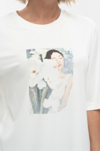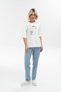 Блуза из трикотажной поливискозы с авторским принтом – простой способ добавить актуальный акцент в образ. Универсальный прямой крой подходит для любого типа фигуры. Втачной рукав до локтя.