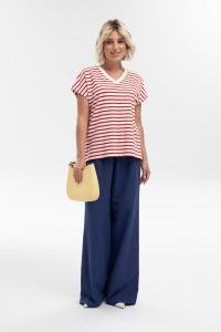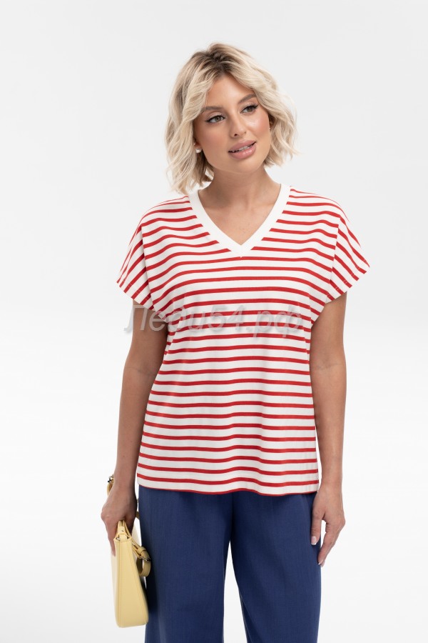 Яркая блуза прямого силуэта со спущенной линией плеча из трикотажной поливискозы в полоску - простой способ добавить актуальный акцент в образ. Комфортная модель разбавит повседневный гардероб и обеспечит не сковывающую движения посадку. V-образный вырез горловины добавит женственности и романтичности.