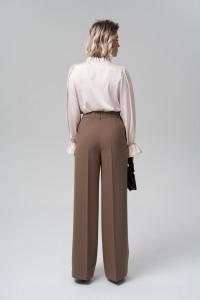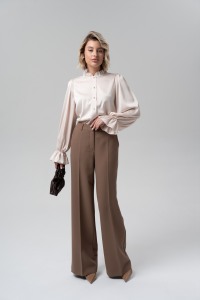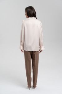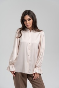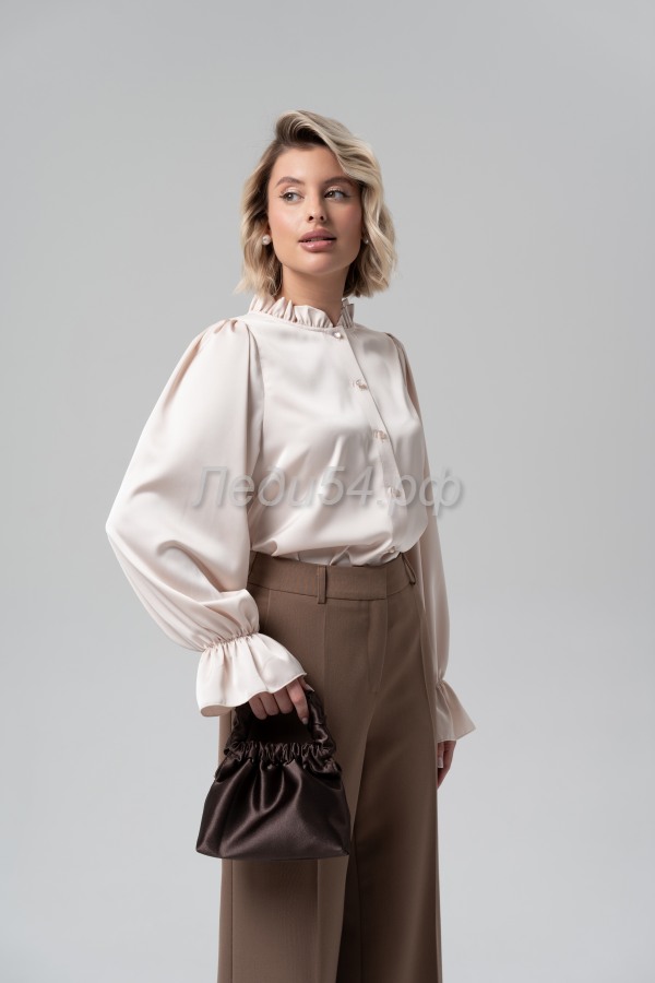Эффектная блузка прямого покроя из струящейся ткани с приглушенным блеском - добавит романтичности в сезонный гардероб. Изящный рюш по вырезу горловины - подчеркнет женственность и без всяких сомнений сделает ваш образ эффектным и незабываемым. Выверенный крой и классическая длина - вот составляющие успеха этого изделия. Широкий втачной рукав полной длины с воланом. Застежка на петли и пуговицы.