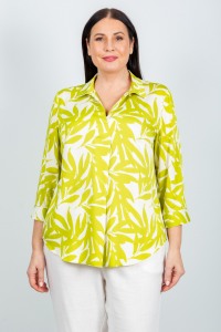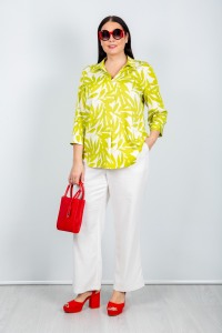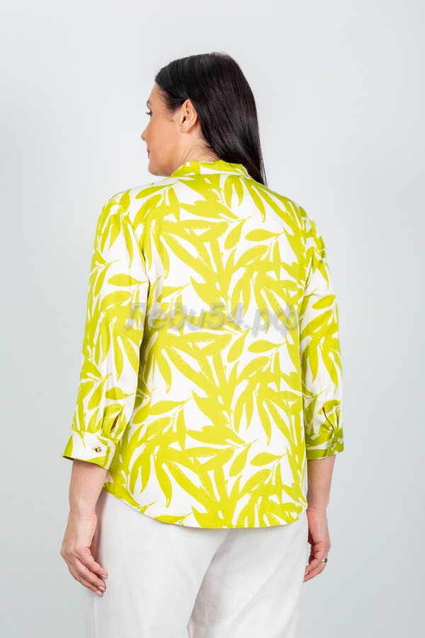 Элегантная шелковистая блуза с ярким принтом. Особенности: классический отложной воротник с V-образным вырезом горловины, рукава длиной 3/4 на манжете с пуговицами, свободный крой с удлиненной спинкой. Блуза прекрасно подходит для торжеств и повседневных мероприятий.