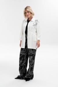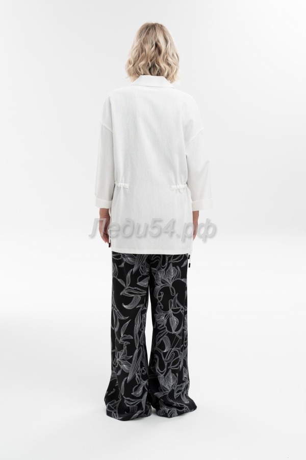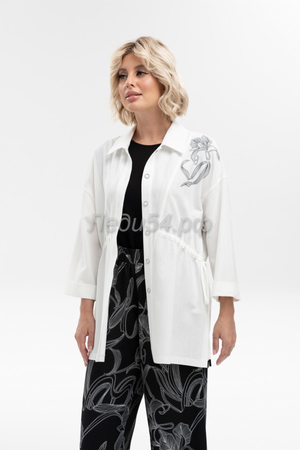 Эффектная удлиненная рубашка прямого силуэта с отложным воротником из льна с добавлением волокон хлопка и вискозы - отлично впишется в летние аутфиты. Комфортный рукав рубашечного кроя полной длины имеет широкую подгибку, что позволяет собрать его или завернуть на мягкую манжету. Регулируемая кулиса по талии - обеспечит комфортную посадку и выгодно подчеркнет достоинства фигуры. Добавит эксклюзивности авторский термотрансфер в виде крупной лилии. Застежка на петли и пуговицы.