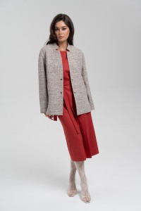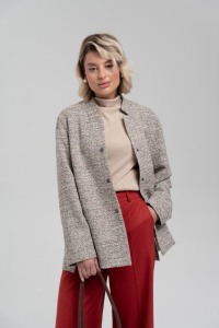 Удлиненный жакет с оригинальным воротником, с потайными карманами и высокими разрезами из костюмного твида - поможет создать стильный и уверенный образ. Свободный силуэт и спущенная линия плеча делают его особенно уютным и комфортным. Рукав рубашечного кроя полной длины имеет широкую подгибку, что позволяет собрать его или завернуть на мягкую манжету. Застежка на кнопки.
