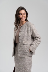 Жакет из меланжевого твида - может стать базовым атрибутом осеннего гардероба. Прямой крой комфортно садиться на любую фигуру. Рукав полной длины. Застежка на потайные кнопки.
