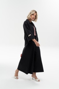 Жакет прямого силуэта с отложным воротником, с контрастными рОговыми пуговицами и декоративной тесьмой в сочетании с авторскими нашивками - будет органично смотреться как в повседневном образе, так и в офисном, создавая особенное настроение. Свободный силуэт и спущенная линия плеча делают его особенно уютным и комфортным. Рукав длиной до локтя с мягкой манжетой. Застежка на петли и пуговицы.