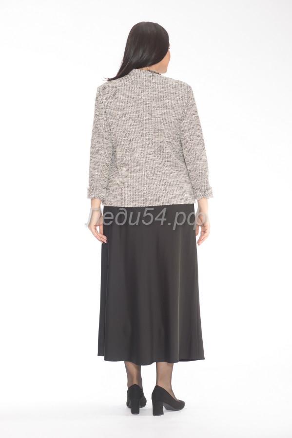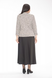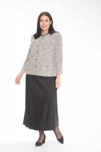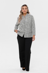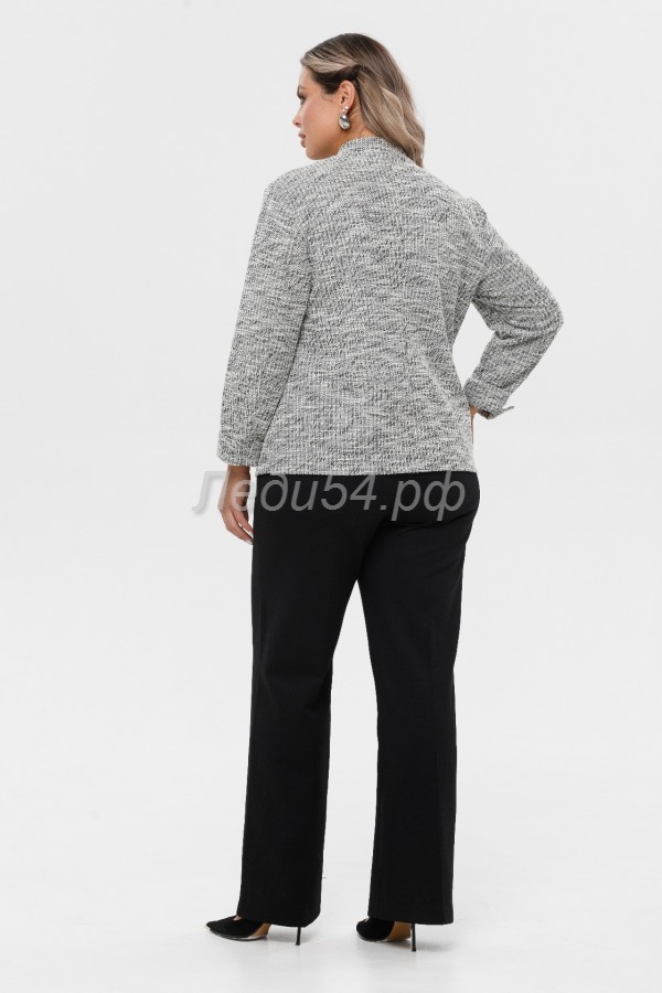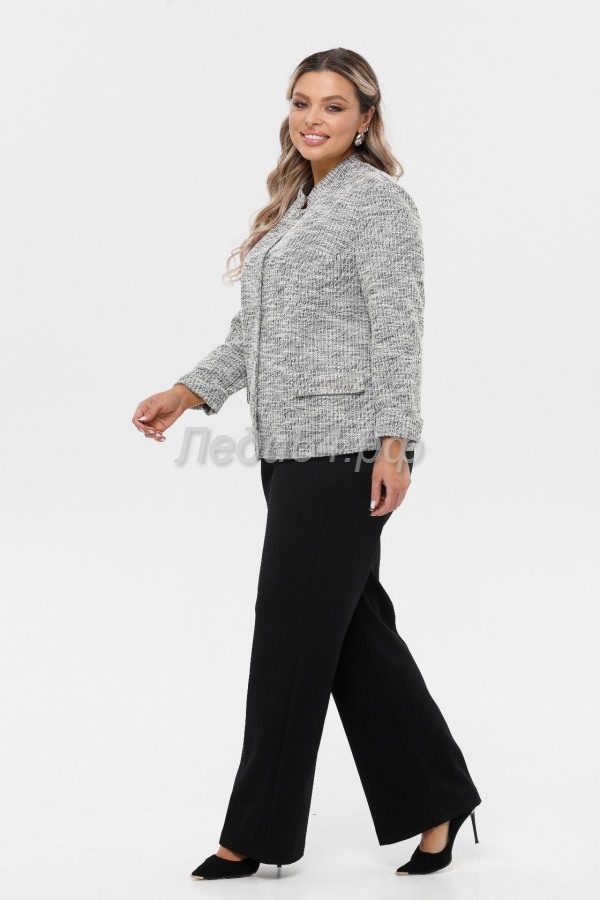 Жакет в стиле Шанель из ткани серо-белого цвета. Фасон прямой, слегка удлиненный. Воротник-стойка, застежка на пуговицы спереди. Этот жакет представляет собой классический элемент гардероба в стиле Шанель. Он сочетает в себе элегантность и практичность, подходит как для офиса, так и для более формальных мероприятий. Совет стилиста: для делового образа сочетайте жакет с прямой юбкой или брюками в тон, добавьте шелковую блузу и классические туфли-лодочки. Для повседневного образа комбинируйте с джинсами и белой футболкой. Этот универсальный жакет станет отличным базовым элементом гардероба, который можно адаптировать под различные стили и ситуации.