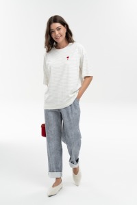 Свободные брюки зауженного кроя из облегченного денима с защипами по талии, с карманами, на притачном поясе-кокетке с резиной по задней половинке брюк, застегивающимся на пуговицу-болт - безупречно подчеркнут любую фигуру. Добавит эксклюзивности термотрансфер со стилизованным лого от OPEN FASHION.