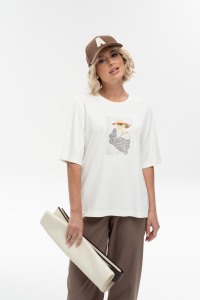 Блуза из трикотажной поливискозы с авторским принтом – простой способ добавить актуальный акцент в образ. Универсальный прямой крой подходит для любого типа фигуры. Втачной рукав до локтя.