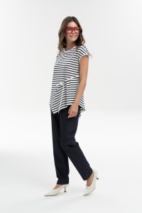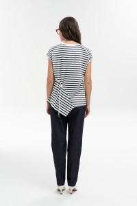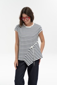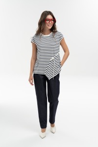 Стильная блуза прямого покроя из струящейся трикотажной поливискозы в полоску с оригинальным кроем и регулируемой кулисой - подчеркивает силуэт, создавая женственный образ. Круглая горловина обработана фактурным кашкорсе для лучшего прилегания.