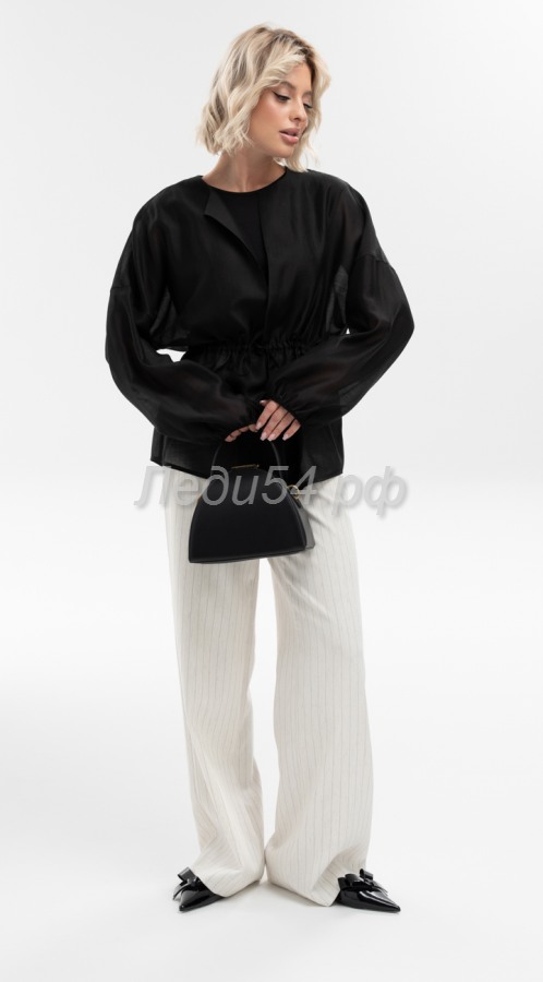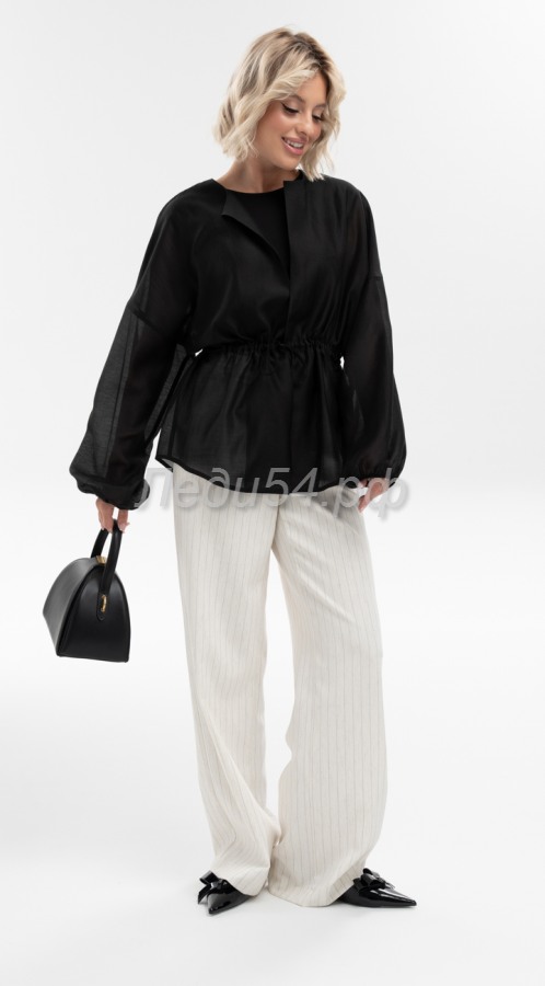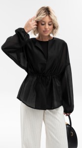 Блуза свободного кроя с кулисой по талии с акцентом на воздушность и легкость ткани создаст женственный и романтичный образ. Прозрачный текстиль из лиоцелла невесомо струится и почти не ощущается на теле. Широкие рукава фантазийной формы полной длины на эластичной резине. Без застежки.