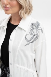 Эффектная удлиненная рубашка прямого силуэта с отложным воротником из льна с добавлением волокон хлопка и вискозы - отлично впишется в летние аутфиты. Комфортный рукав рубашечного кроя полной длины имеет широкую подгибку, что позволяет собрать его или завернуть на мягкую манжету. Регулируемая кулиса по талии - обеспечит комфортную посадку и выгодно подчеркнет достоинства фигуры. Добавит эксклюзивности авторский термотрансфер в виде крупной лилии. Застежка на петли и пуговицы.