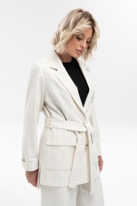 Жакет свободного кроя с английским воротником, накладными карманами с клапаном, удлиненной спинкой и глубокими разрезами в боковых швах из костюмного хлопка в полоску - поможет создать стильный и уверенный образ. Рукав втачной полной длины имеет широкую подгибку, что позволяет собрать его или завернуть на мягкую манжету. Жакет дополнен съемным поясом. Застежка на петли и пуговицы.