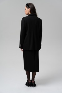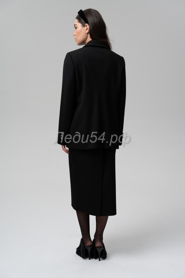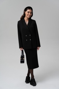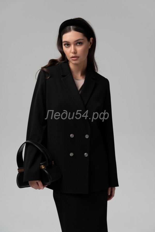 Двубортный жакет полуприлегающего силуэта с накладными карманами из костюмной поливискозы на подкладе - идеально впишется в гардероб любой женщины. Четкая линия плеч, удлиненные лацканы, рельефные вытачки - моделируют графичный образ. Рукав втачной полной длины. Застежка на петли и пуговицы.