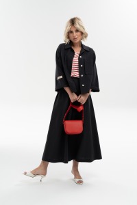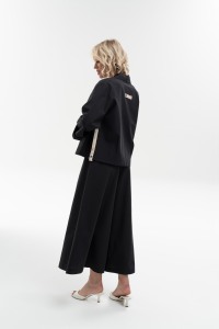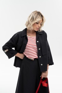 Жакет прямого силуэта с отложным воротником, с контрастными рОговыми пуговицами и декоративной тесьмой в сочетании с авторскими нашивками - будет органично смотреться как в повседневном образе, так и в офисном, создавая особенное настроение. Свободный силуэт и спущенная линия плеча делают его особенно уютным и комфортным. Рукав длиной до локтя с мягкой манжетой. Застежка на петли и пуговицы.