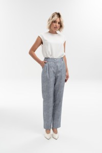 Свободные брюки зауженного кроя из облегченного денима с защипами по талии, с карманами, на притачном поясе-кокетке с резиной по задней половинке брюк, застегивающимся на пуговицу-болт - безупречно подчеркнут любую фигуру. Добавит эксклюзивности термотрансфер со стилизованным лого от OPEN FASHION.