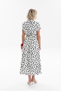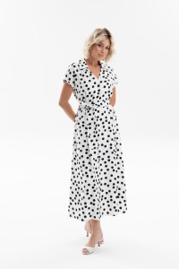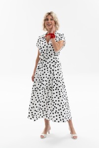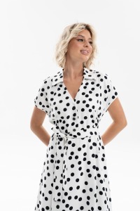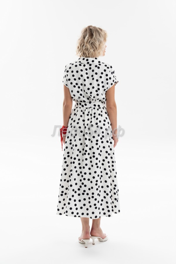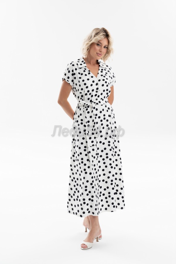 Очень женственное платье, отрезное по линии талии, с отложным воротников, со спущенной линией плеча из вискозы с добавлением волокон района с модным принтом "polka-dot" - позволит выглядеть безупречно, делая образ утонченным! Резинка на талии сформирует идеальный женственный силуэт "песочных часов". Платье дополнено съемным поясом. Застежка по переду на петли и пуговицы. На подкладе.
